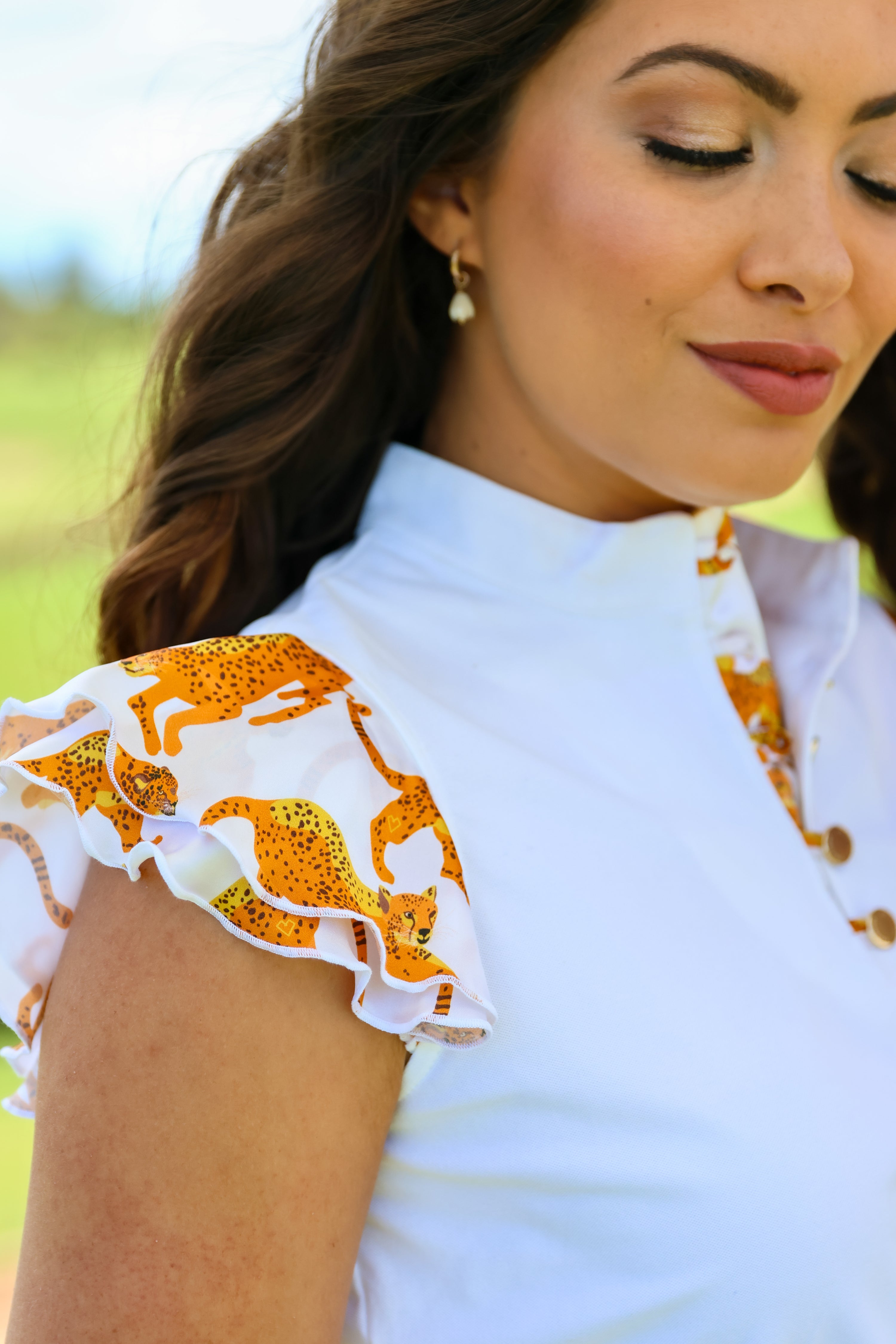 The top features a refined mock neckline finished with a washable silk placket and signature gold buttons, adding a sophisticated contrast to its performance pique body. Playful double flutter sleeves in our exclusive cheetah print bring movement, charm, and a fashion-forward edge — striking the perfect balance between bold and feminine.