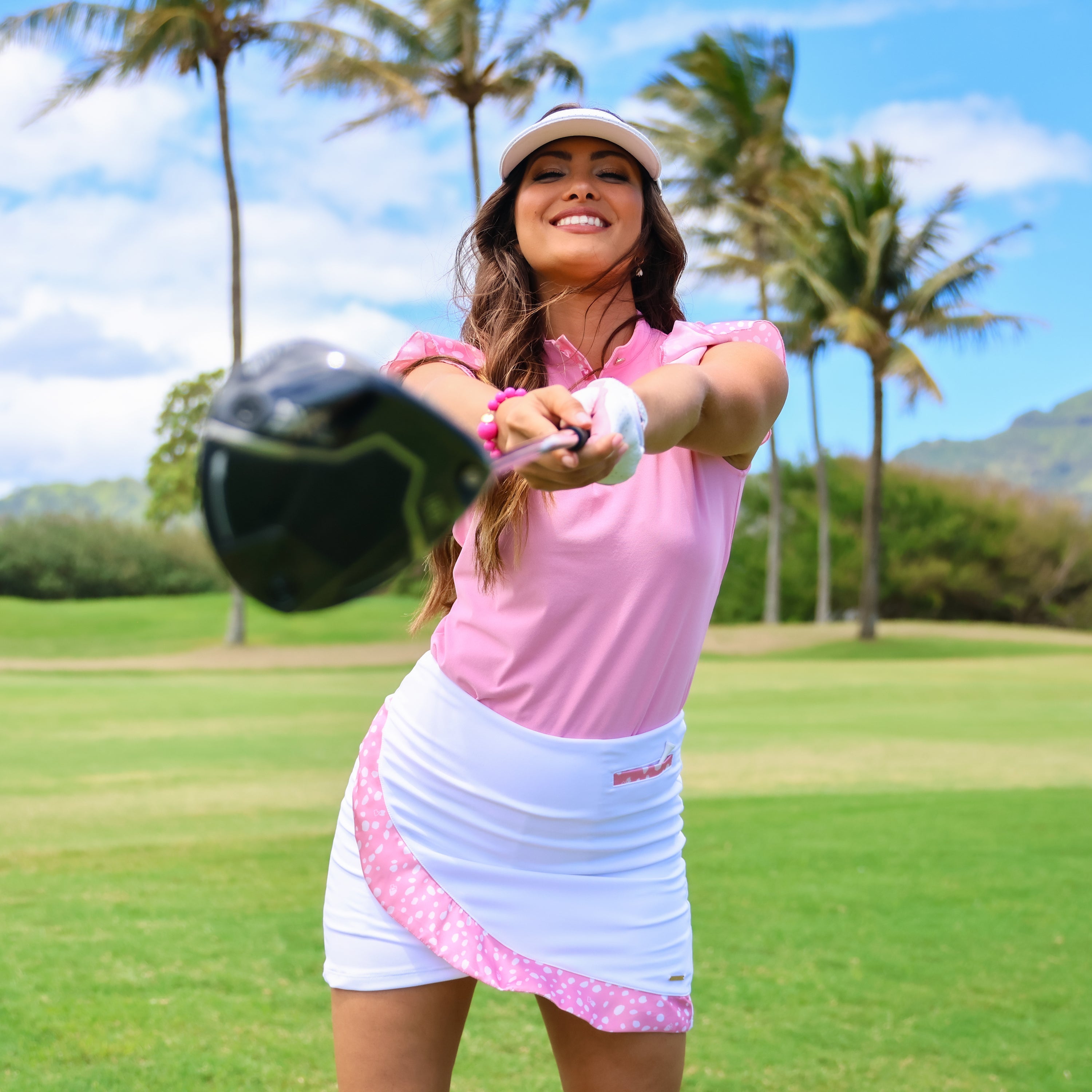 The Social Butterfly Club Skort in White with Get Spotted Pink is the ultimate Barbie golf chic moment. Designed to turn heads on and off the course, this standout skort features our signature Get Spotted Pink print—a playful blend of cheetah spots and polka dots—finished with a flirty washable silk ruffle cascading across the front. Whether you’re teeing off or sipping something bubbly at the clubhouse, this skort guarantees you’ll get spotted.